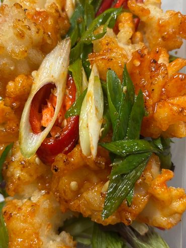 Deep fried Prawns in a light batter sauce served with sweet chilli sauce.